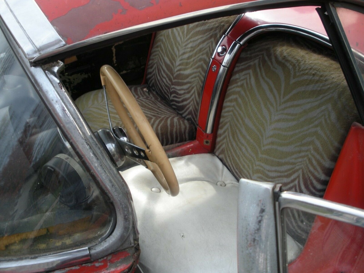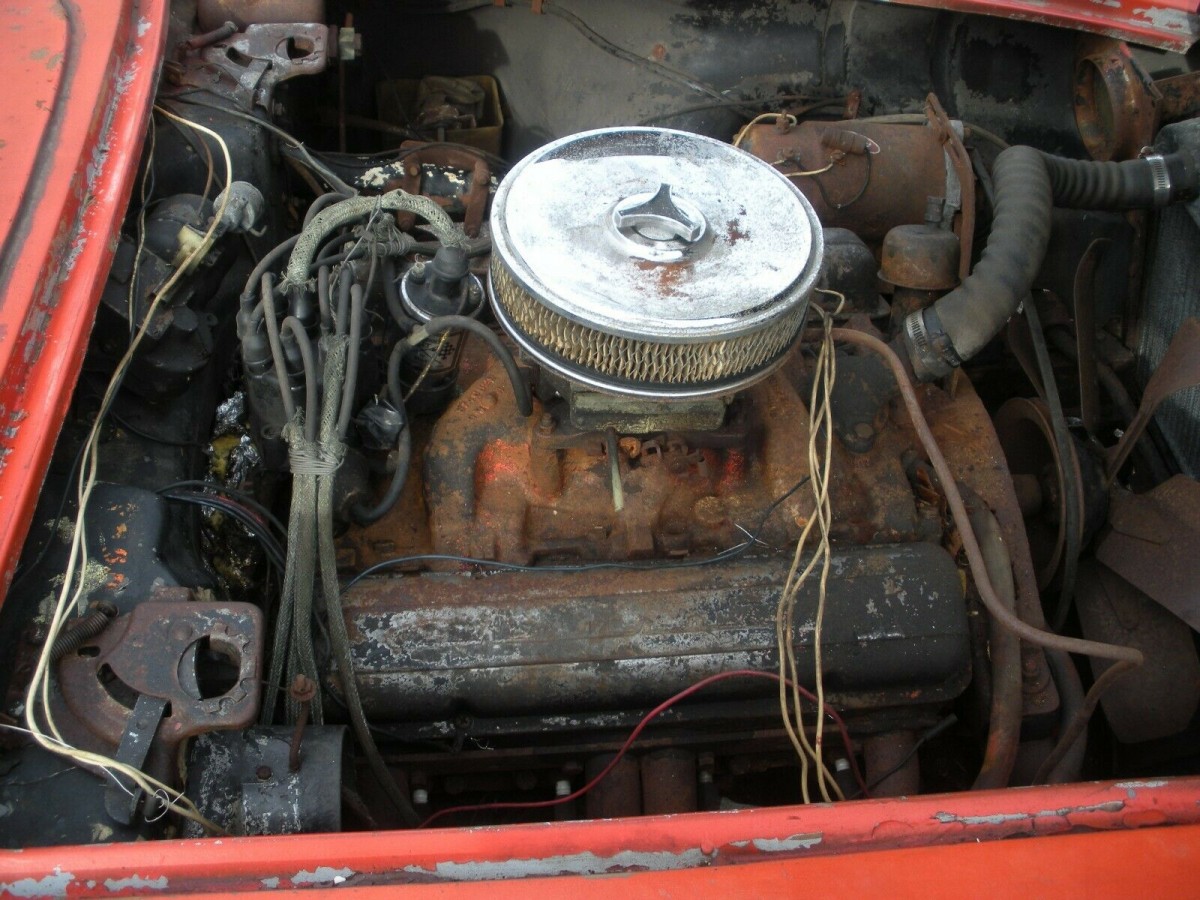 This Corvette sports a tiger-striped interior which though intriguing is not a factory offering.  The steering wheel is aftermarket, the factory tach has been replaced, and a supplemental tach is to the left of the driver.  Plan on a full interior refresh and the eviction of at least one family of mice who reside in the passenger door shell. Details on this car are scant in the listing, though mention is made of overall completeness and some refurbished brightwork.  The listing photos tell the story on this one.  It could be the platform for a good restoration project or you could just roll a new chassis under it, drop in a crate 350, and leave the body as is.  However, whatever you do, you might want to run this one by your spouse first.