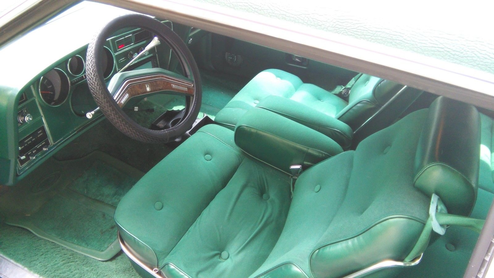 The GREEN (yes, it is yelling at me) interior has air conditioning, cruise control, power locks, power windows and power seats. Apart from some stretching of the original upholstery it looks great, and are those factory Ford floor mats? 87,643 miles are believable based on the appearance. We’re also told it has a CD player, which I’m pretty sure wasn’t original for 1976 as the first CD player was introduced in 1982.