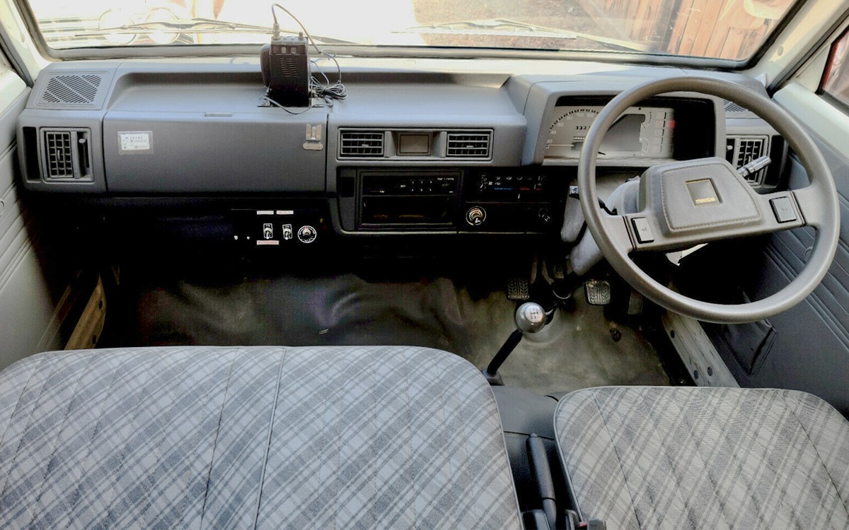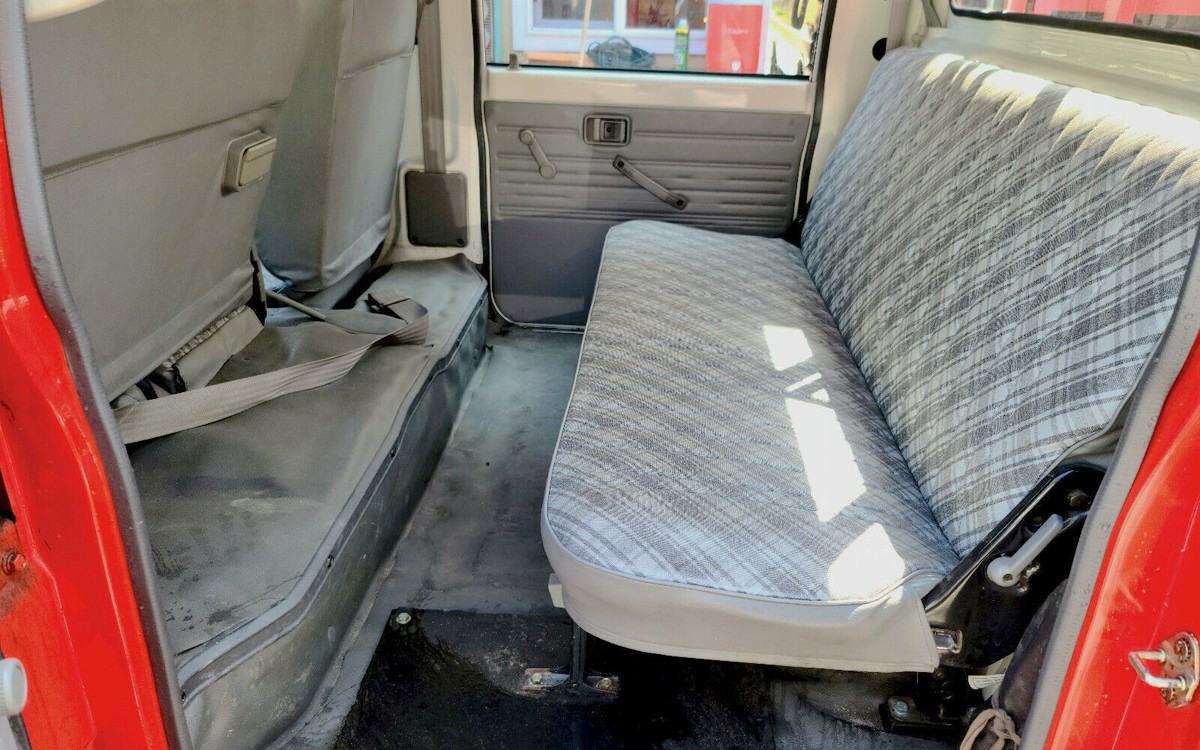 The seats in this baby look like all of my socks back in the late-80s, but the whole interior appears to be in great condition. The back seat can fold up out of the way but it doesn’t look like it really gives that much more room for hauling things than keeping the seat folded down. The seller says that this “crew cab pickup was once a small town fire truck in the Asakita Ward of the Hiroshima Prefecture of Japan”, and it has fewer than 6,000 miles. It really looks like a nice one other than having a little ding in the “nose” that hopefully can be massaged out.