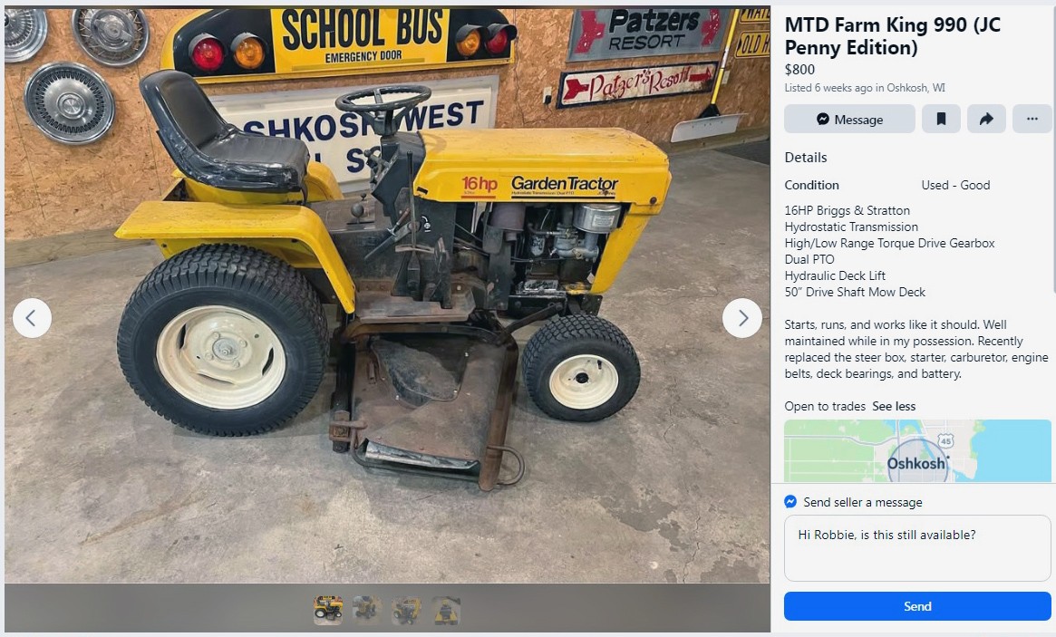 Catalog companies spent decades rebadging products made by others and offering them to consumers as something made by Sears-Roebuck, Montgomery Ward, JCPenney, and many others. This JCPenney 16HP Garden Tractor (basically an MTD 990) is listed here on Facebook Marketplace in Oshkosh, Wisconsin, and they’re asking $800. Here is the original listing, and thanks to Lothar… of the Hill People for the tiny tractor tip! If it were a bit more local, I’d be all over it. I’m a big fan of Montgomery Ward (Wards) lawn equipment, and this “Penneys” tractor would be fun to own.
