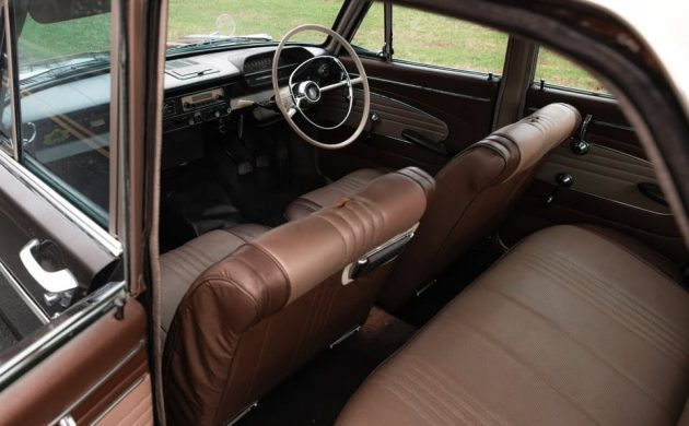 The plain dash houses a period radio and basic gauges, but relieving its austerity are several bits of bright trim. The steering wheel is cracked. The seats wore headrests at one time, and now show tears where they were removed. The car is right-hand drive; the driver’s left bolster is torn. A bit of brightwork is missing from the driver’s side door panel. Nicks, scrapes, dents in the trim, and rust of varying severity afflict the entire car from stem to stern – nothing too objectionable on its own but the sheer number of admittedly minor cosmetic blemishes helps explain the failed sale in May.