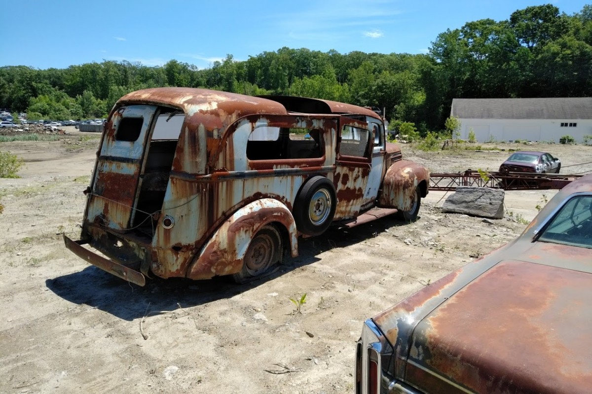 The one in the junkyard is a Siebert, and likely either an ambulance or what funeral homes called a “First removal car” to transport a body from the home or hospital to the funeral home.