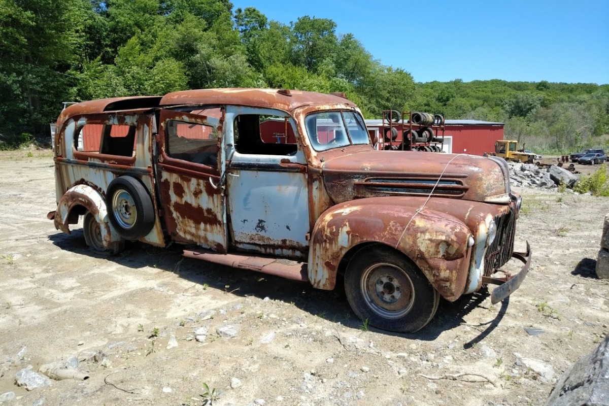 Looks like a commercial-chassis GM ambulance or hearse (maybe a Packard?) was grafted onto a plain Ford panel or pick up truck. The work done took it’s toll on the side panels. I can see where the back may have also started out life as a GM or Ford open produce wagon which are well documented before here on Barn Finds.