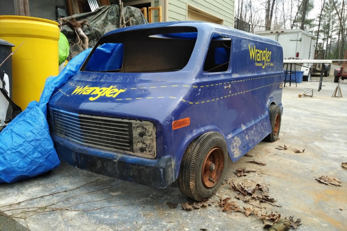 Obviously, this go-cart was built as a promotional item for Wrangler Jeans. This was not an uncommon practice at one time, though I can’t fathom how a clothing company would benefit from having a go-cart running around with its name on it. For car dealerships, gasoline stations, parts sellers, and the like, it makes sense – but why the director of marketing at a company hawking dungaree wanted one of these is beyond my ability to fathom. The body is fairly generic, but the head- and taillights point to the original design being a homage of sorts to a Ford Econoline.