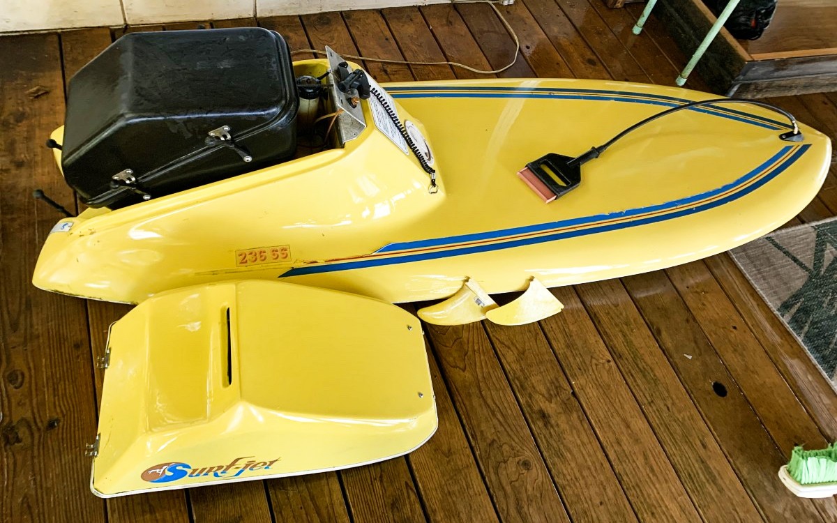 Having grown up in Wyoming, surfing wasn’t exactly something one could do easily, but I sure thought it sounded like fun! Well, it seems someone else felt my pain and came up with this wonderful contraption that let you “surf” in any large body of water. Or at least that’s the best reason I can think of for creating a motorized surfboard. Reader Keith A recently dug this 1983 SurfJet Freestyle 236SS survivor out of storage and thought we might enjoy seeing this unique find. It’s definitely not something you come across often. Our thanks to Keith for sharing his SurfJet with us!