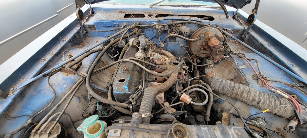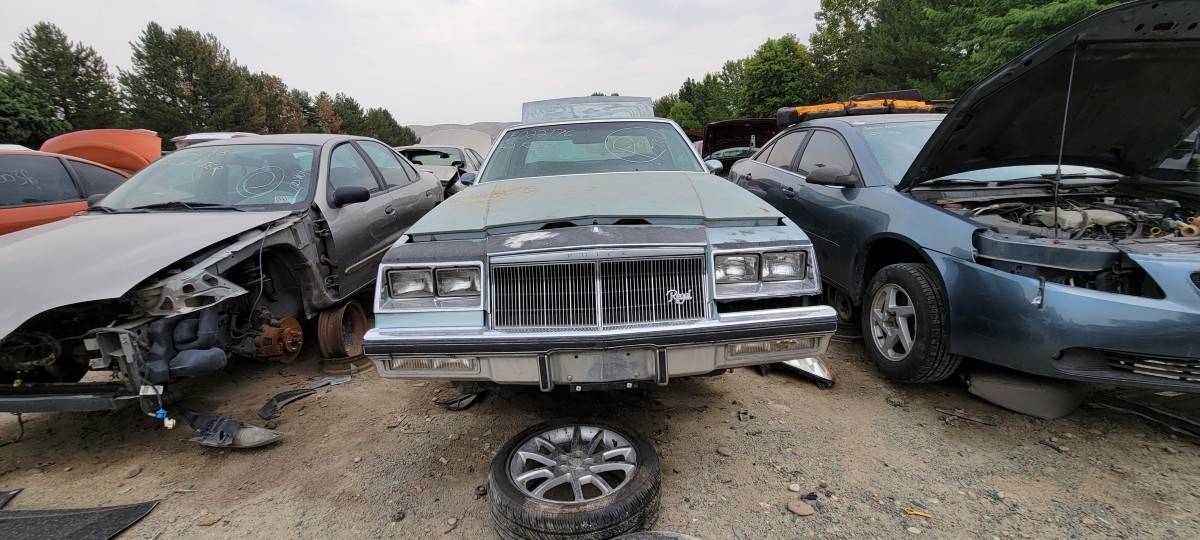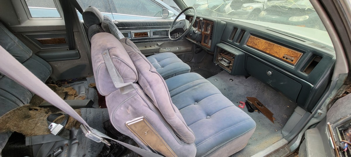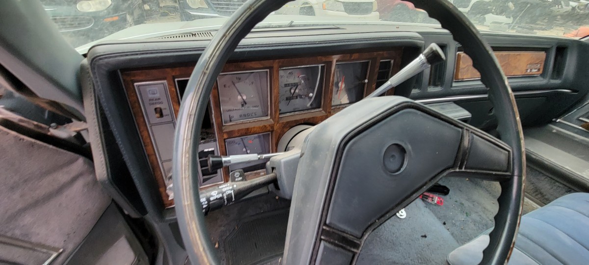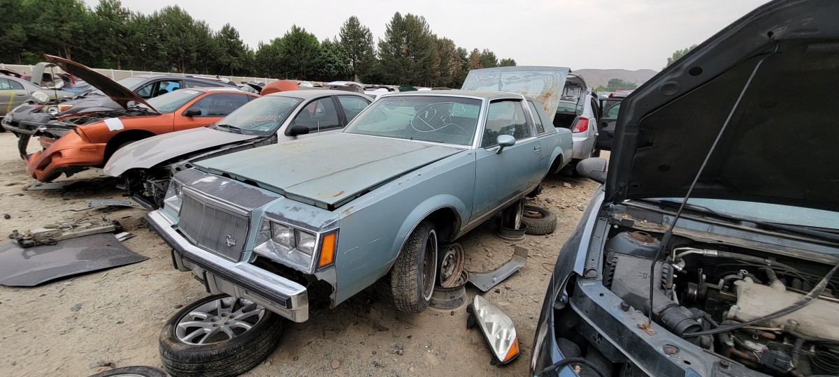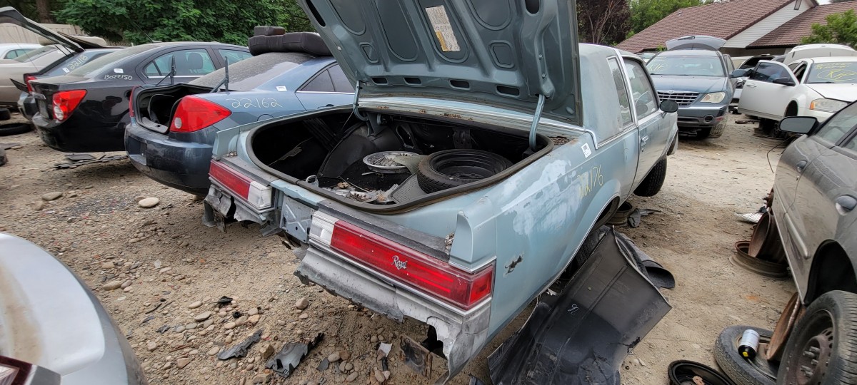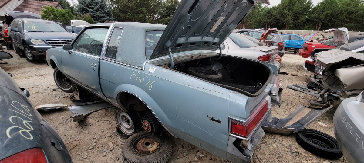 After looking at the Volare, I checked for a radiator for the 740, but didn’t have much luck. Before leaving the yard and heading for the one down the street, I decided to make a quick pass through the rest of the yard. That’s when I spotted this 1982 Buick Regal. It didn’t have an parking ticket on it, but I spotted an old registration slip with an address on the same street that the others had been parked on illegally. Of the three, it’s definitely the most complete. It looks like scavengers have only picked a few pieces off of it at this point, but I doubt it will stay that way for long. When I check under the hood, I found a complete V8. I couldn’t find any indentification as to whether it’s the two or four barrel 305 V8, but it was definitely a well optioned car.