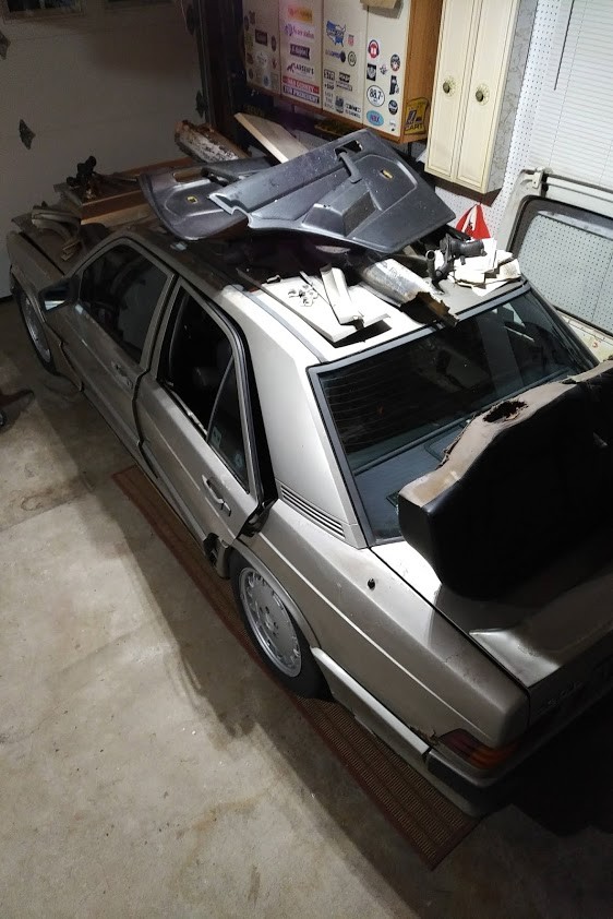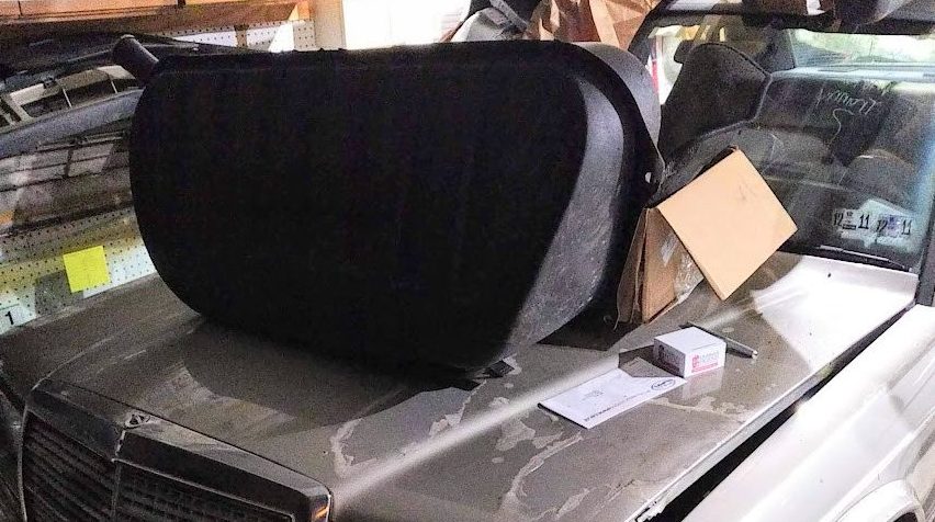 When the Mercedes was picked up, there was no hiding where it had been these last few years: it was literally plucked from a back row of a Pennsylvania salvage yard and moved out front so it be pushed into my shipper’s trailer via forklift. The 190E was a bit lighter than stock, however, due to some missing parts. Most I knew about – the 16V-specific radiator was sold off, as were the rear window regulators (resulting in the back glass being smashed to pieces). But when the car arrived, I saw the 16V gas tank was no longer with the car. This was a problem: the gas tank on the 2.3-16 was enlarged from 55 to 70L, in keeping with the car’s track-oriented nature and endurance racing history. It needed the larger tank.