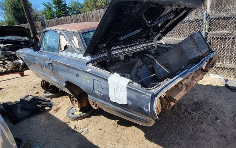 Now, this is one that you really don’t see in junkyards anymore, or at least you really shouldn’t. This 1965 Ford Thunderbird somehow ended up in a pick-and-pull yard here in Boise, rather than with someone who could have restored it. Since landing here, its drivetrain and interior have been stripped of lots of components, so at least it’s giving another car a chance to stay on the road. These cars are really quite impressive, especially on the inside, so we thought we would document this one before it’s melted down for scrap.