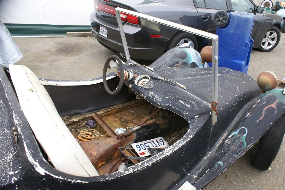 Like so many VW-based kits, the engine is long gone. The old-school California blue plates tell you it’s been off the road for some time, and likely has been in California for much of its life (an assumption based upon the need for a favorable climate to justify owning one of these.) Based on photos in the listing, the pickup-type body is filled in, so either Kellison offered this variation or a previous owner decided the storage bed looked goofy.