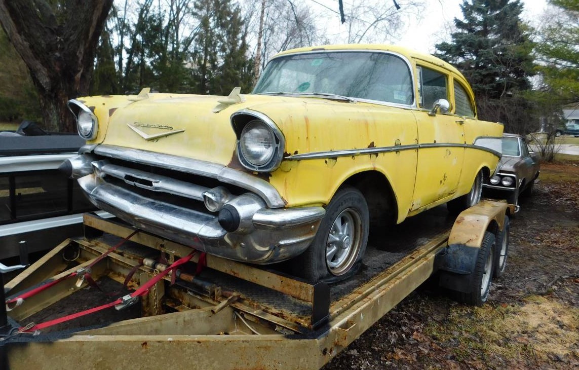 The interior is in no better shape than the exterior and the front and rear seats don’t match. A new fuel tank has been installed, perhaps in a more recent attempt to get the Chevy running again, but to no avail. The small-block engine could be either a 265 or 283 (which was new in 1957), but there is no indication of its originality or when the car gained the 4-speed manual. The seller is pretty adamant on the price and will deliver it for a fee, but we assume there is a limit to the mileage he/she would be willing to go.