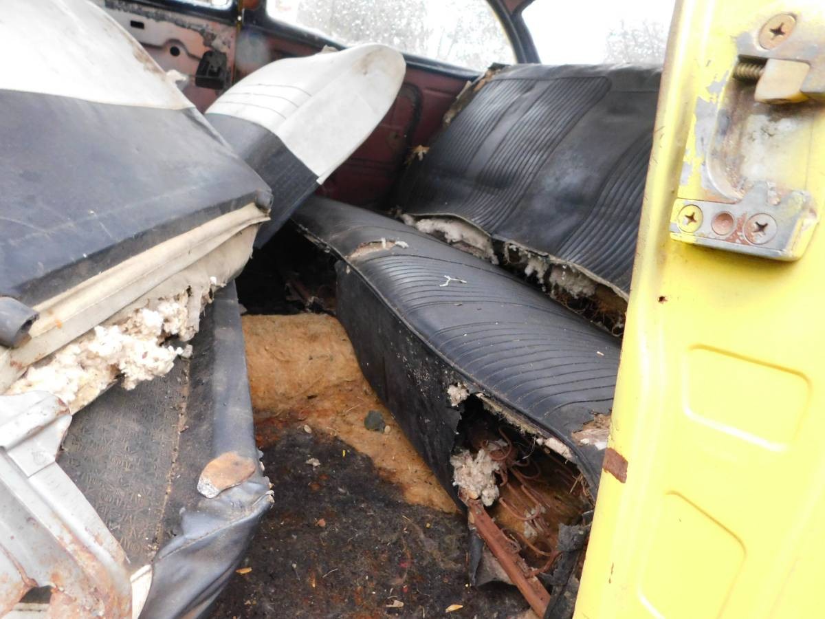 We’re told the automobile here has been sitting indoors for several years, but that doesn’t mean it wasn’t exposed to the elements. There is a lot of surface rust on the sheet metal, and the seller admits it will take “some patches” that might turn out to go deeper than that. The yellow paint is not original given some overspray found in a couple of places, nor does it look like a factory color. Some of the trim is missing or rusted as is the rear bumper. The body shop is going to stay busy on this one for a while.