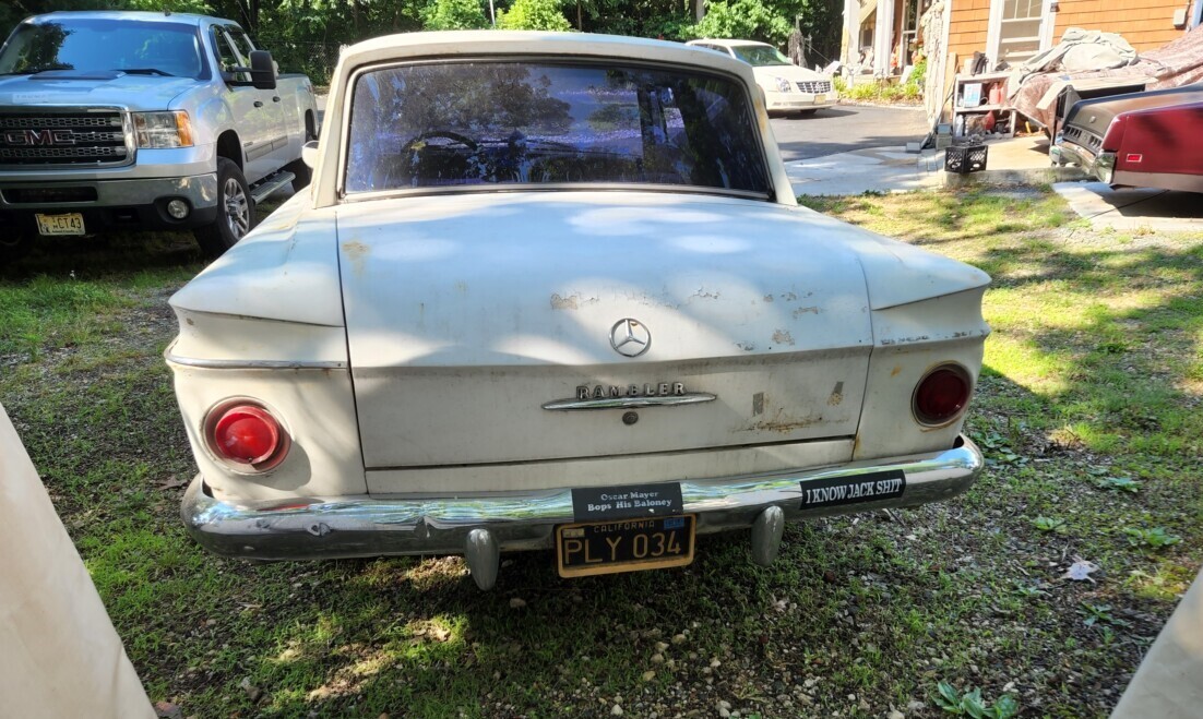 Love the Mercedes-Benz badge on the trunk! I don’t think it’s fooling anyone though. (Some of the bigger Ramblers from the late 1950s did resemble Mercedes of that time if you squint a bit.)