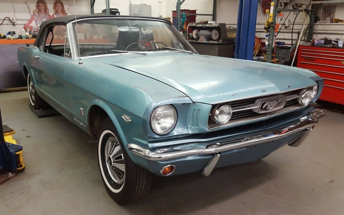 The standard Mustang interior in this car is a bit surprising as I was expecting to see the nicer pony interior. But this passenger cabin appears to have survived nicely and we assume the seats and all have been removed in order to jump-start the restoration process. The convertible top looks rather good and we assume that lowering or raising it is a manual operation. The reported 65,000 miles look to have been easier ones than the hot engine would suggest.