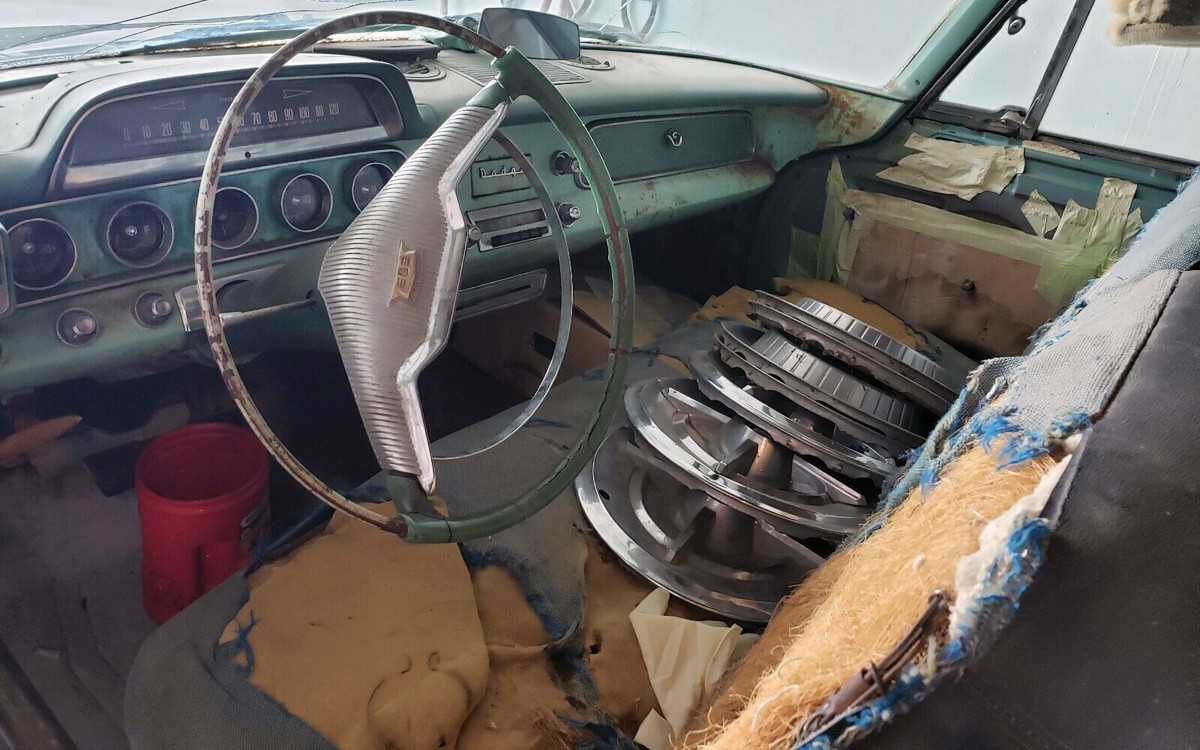 This won’t be an inexpensive restoration by any means. We don’t see the underside at all but if it was sitting outside for an extended time to fade that paint as much as it has, I’d like to see the underside. Especially since the floors were bad enough to have been replaced. Trim pieces and details like that will be crucial, hopefully a good portion of those pieces come with the car.