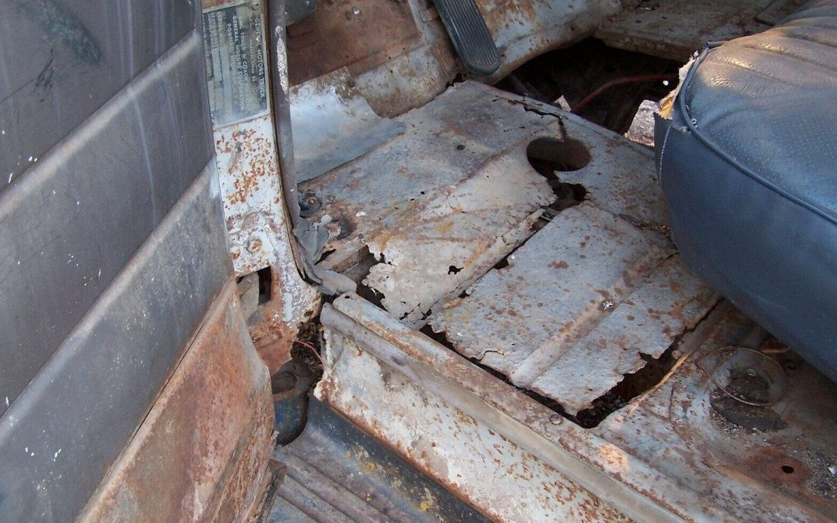 Here is a closer photo of the floor. As you can see, the driver’s side is pretty rotten. It doesn’t look like much is holding it together. The good thing is there are numerous aftermarket sources for replacement sheet metal like the ones found here.