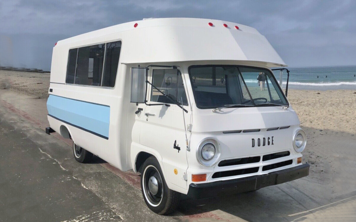 The seller says that this 1969 Dodge A100 Balboa van camper was rescued from a field in Kansas. It appears to be in great condition, it looks like they did a nice job of bringing this one back and they think that it may be the very first one built by the company as it’s marked as Model 1. They have it posted here on eBay in impossibly beautiful Cardiff by the Sea, or Cardiff, California. The current bid is $13,100, and the reserve isn’t met.