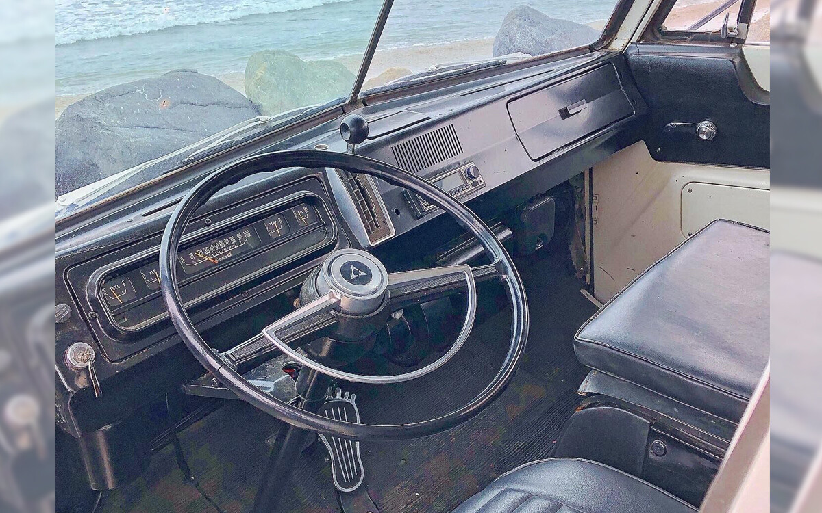The cab appears to be in really nice condition, and that bare-foot gas pedal is killer! This rig has a three-speed A727 automatic with a shifter on the dash to the right of the steering wheel and a big pad over the dog house (engine compartment) where someone may have sat before there were many (or any) safety regulations related to such things. The rear door gives a lot of space that isn’t broken up by having a door on the right (passenger) side as shown in this panorama photo.