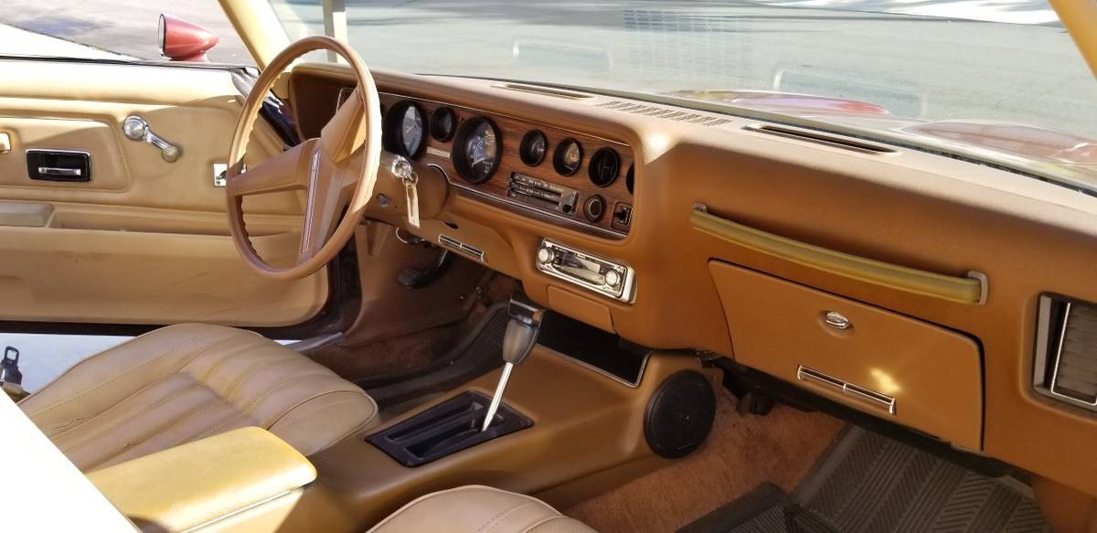 My college car! Same color scheme inside and out. Only a couple little nits to pick…the grille nacelles would not have been entirely black, and on my 76 the steering wheel was not a three spoke, standard Pontiac. That interior was indeed a bear to keep clean, and my pale carpet turned to a dreadful mustard yellow after a few years.