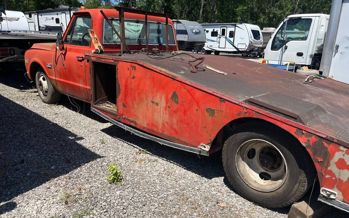 So, what exactly do we have here? The seller states a Sierra 3500, and that seems correct though I believe that the “Sierra” name was introduced in ’72 – small matter. Things get more confusing thanks to the Chevrolet bowtie attached to the hood. All-in-all, it seems to be in pretty fair shape for a 51-year-old work vehicle that has spent probably most, or all of its life outdoors. There’s lots of surface rust but lot’s of solidity too. Included images of the underside reveal nothing serious – just more surface rust.