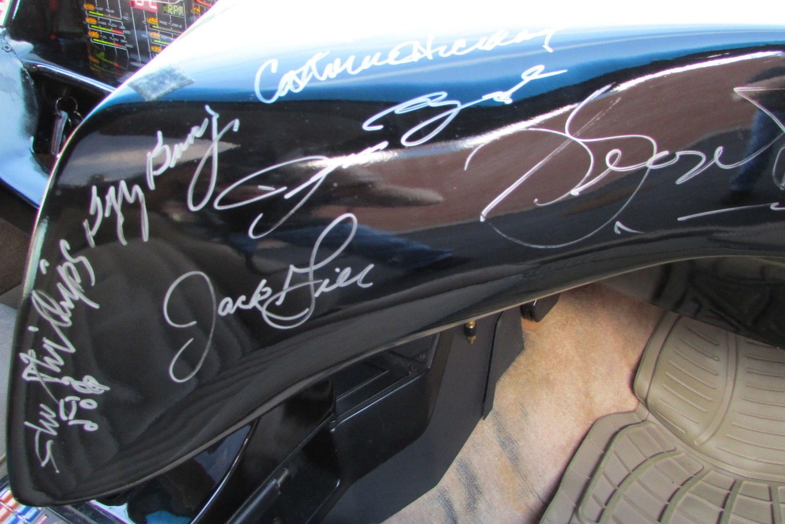 The ad mentions that the car’s passenger side dash has been signed by George Barris, Glen Larson, Michael Scheffe, Justin Bruening, James Winburn, Rebecca Holden, Catherine Hickland, Buzz Bundy, Jack Gill, Ann Turkell, Ron Martinez, Don Peak, Paul Campbell, Deanna Russo, Stu Phillips, and Dennis Braid. The seller also states that this car was “used/driven by David Hasselhoff for Knight Rider Festival, LA Music Video” filmed at the Hasselhoff Home. The seller does not mention this being an original KITT from the TV series, so one can assume it is a tribute.