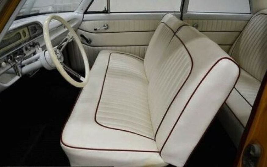 The exterior is finished off in what is referred to as “House of Kolor Solar Gold” with a contrasting orange, geometric, psychedelic roof – it’s something to see. The rest of the exterior is pretty standard Fairlane 500 in terms of the trim, bumpers, and grille though the badging appears to have been removed. The underside is a bit scary looking, it’s surprisingly untouched and there is heavy surface rust or scale apparent. Rounding out all four corners are chromed, American Racing Torque-Thrust wheels mounted on white-stripe tires, period correct for the early ’60s.
