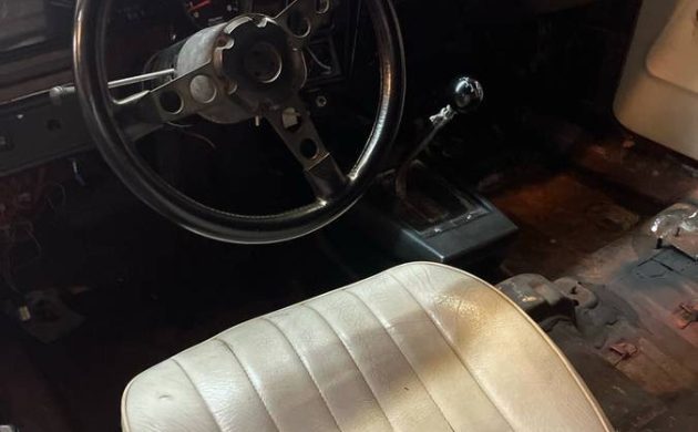 Pontiac produced the GTO from 1964 to 1974, with the model widely credited as the first true muscle car. The nameplate returned on an Australian-built Holden from 2003 to 2006. However, the last year for a Pontiac powered GTO was 1974 and only 7,058 were produced. The interior of this GTO shows that it is a project car and still needs some work including a passenger and rear seat installed along with carpet. The shifter for the automatic transmission can be seen in this picture along with the Formula steering wheel.