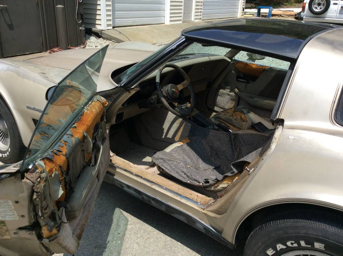 an ’82 Collectors Edition….given its unique multi tone leather interior, exterior graphics and paint is probably the most expensive Corvette to totally restore for the least return. Neat cars in excellent condition…yet this one is sadly not. The Crossfire FI, although quite usable, suffered from acceleration inadequacies. Sad to see this deteriorated example.