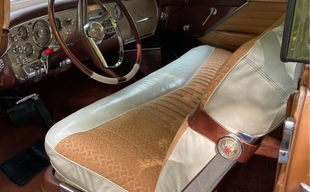 Having covered just 57,000 miles, this Packard has held up well after almost 70 years. It’s finished in Mojave Tan paint, which is an older redo with a few imperfections. But the yards and yards of chrome look to be flawless. The original interior is showing its age, but it is still good except for a few small holes in the headliner. Both the radio and clock work but are temperamental. If you want perfection, this is not your car, but it is a nice survivor-quality automobile.