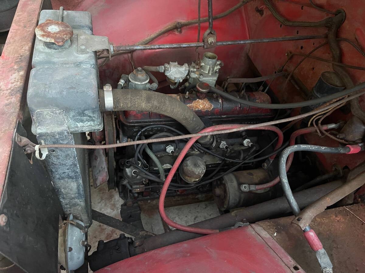 Until 1949, Crosley used the aforementioned CoBra engine (aka the “Mighty Tin”), a 44 cu. in. overhead cam four-cylinder producing 26.5 hp, paired with a three-speed non-synchro manual. Top speed was about 50 mph. The brakes were mechanical. The CoBra motor with all its ancillaries including the flywheel only weighed 133 lbs. But it had a tendency to come apart if mistreated and was replaced in 1949 with a conventional cast-iron block that Crosley dubbed CIBA. This motor remained in production for decades after Crosley’s failure. It achieved fame on the track, both here and in Europe’s 750 cc classes. This car’s oil-bath air cleaner has gone missing, and it doesn’t run.