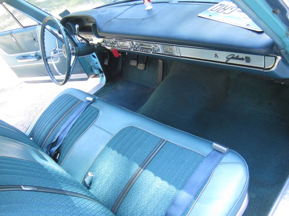 I LOVE this car, perfect color and everything. I found a dealer film strip from Chevrolet comparing this year of Galaxies to Impalas. Being a Ford man, I had to watch it to see what Chevy had to say. They had a woman wearing a sweater slide across the seats of both, and the space-agey metal flakes in the Galaxie’s upholstery snagged it! I’m not sure how many Chevy dealers tried to use that, but it was funny to see. I’d have this car in my driveway right now if I had the money.