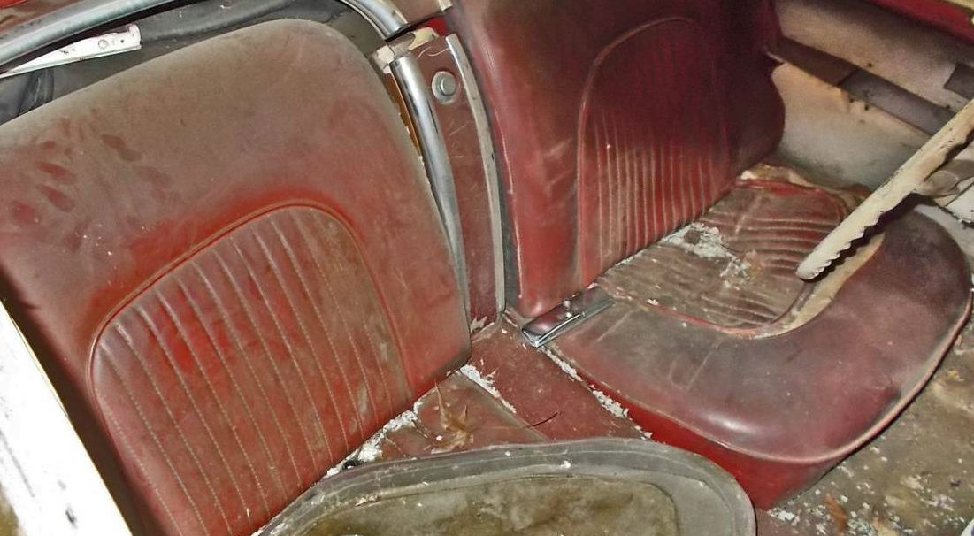 The badly crazed red looks like it has been applied over original white paint, possibly to match the red vinyl interior. But do you think the red vinyl is original in this car?
