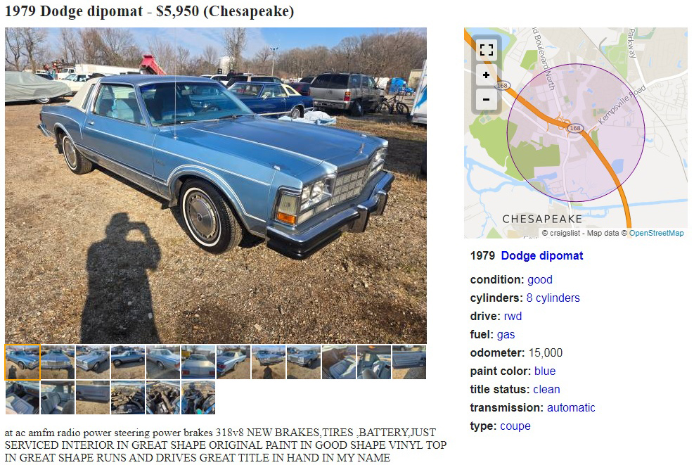 Cadet Blue Metallic, I believe, is the color of this beautiful, very cool, last of the boattail Dodge Diplomats. It’s a bummer that the seller didn’t show at least one full photo of the rear 3/4 view, but you all know what they look like, so it probably doesn’t matter in the grand scheme of life. This 1979 Dodge Diplomat 2-Door is posted here on craigslist in Chesapeake, Massachusetts, and they’re asking $5,950. Here is the original listing, and thanks to Rocco B. for the tip!