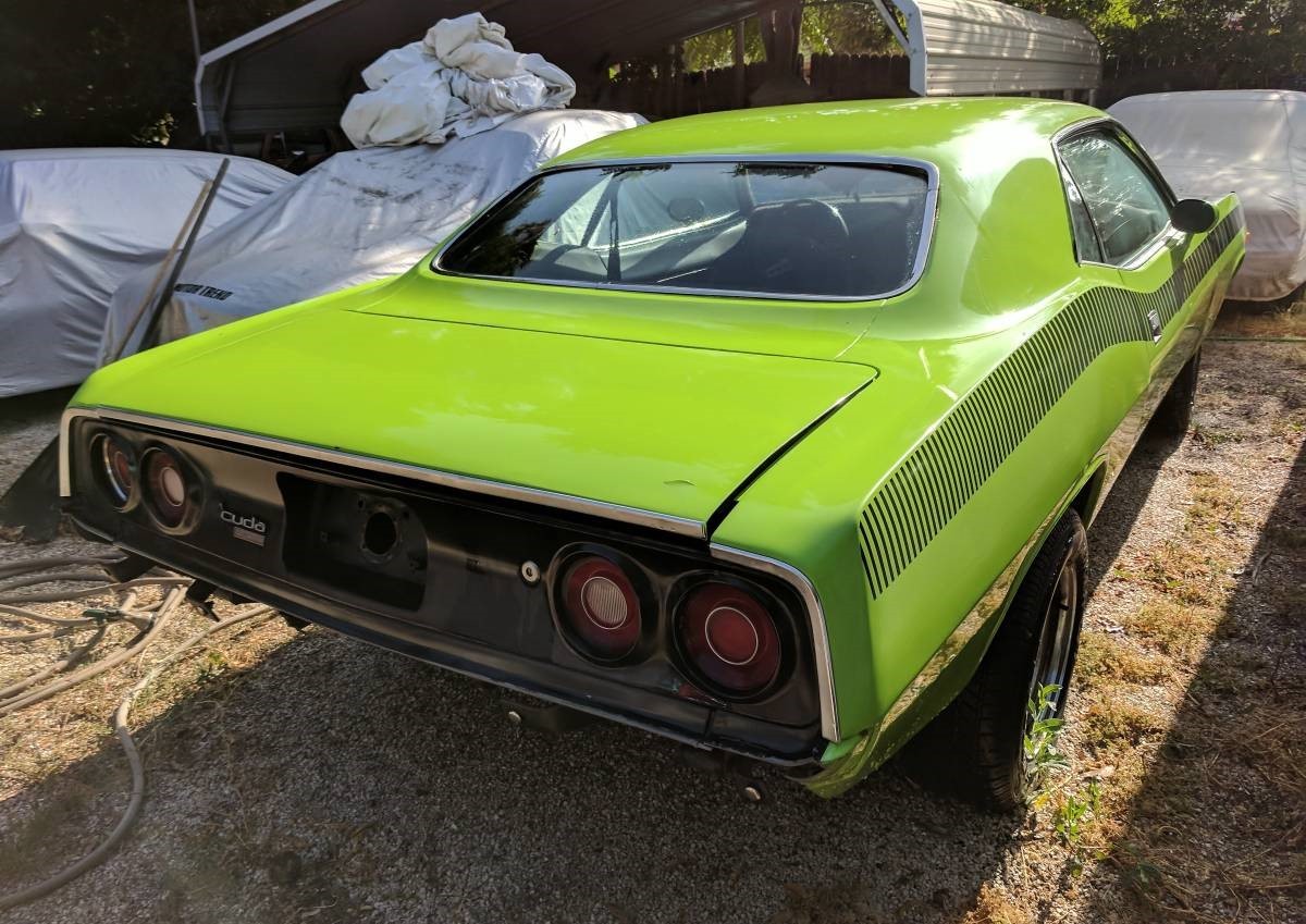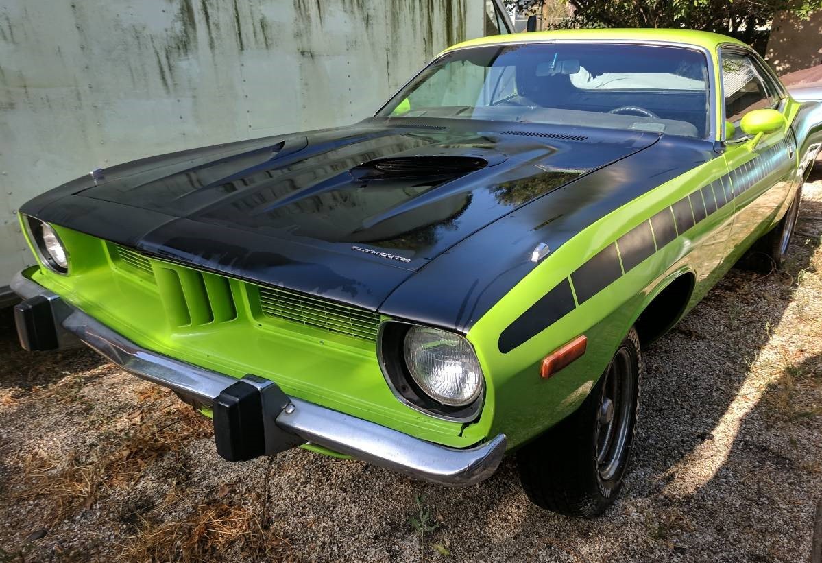 The seller and the car’s VIN seem to agree that this is a ’74 ‘Cuda. The car appears finished in Lime Light paint, one of Chrysler’s Hi-Impact colors, though sources suggest those were phased out after the 1973 model year. Only three photos are provided, so determining if another color is on the car anywhere isn’t possible. At less than 75,000 miles, this Plymouth is said to have had a rebuild of its 150 hp motor and tranny, and the car came with bucket seats and air conditioning. Though the paint looks okay, we’re told the car has rust that needs repairing in the trunk, rear quarter panels, and front floor pans. Without seeing the car in person and given the work needed, the lack of a hot powerplant suggests a lower cost of acquisition may be needed to make the project viable.