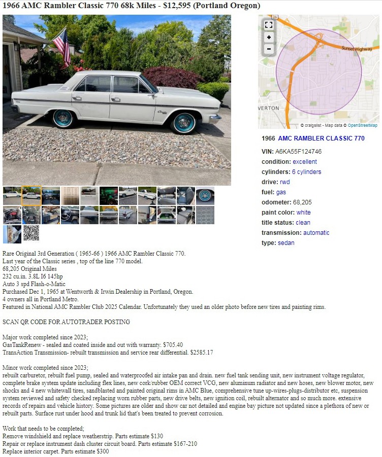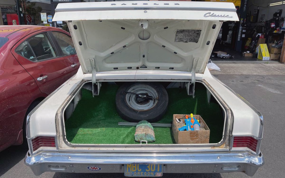 Let’s see, some ramblin’ songs include, Ramble On, Led Zepplin, Ramble on Rose, Grateful Dead, Ramblin’ Gamblin’ man, Bob Segar, several country artists, but oddly, none about a Rambler. My son lives in Portland and I can’t imagine a worse place for vacuum wipers. The car itself is yet another wonderful example of what’s a hiding in them thar garages yonder, and has a great chance of being enjoyed, because? That’s right, the automatic. I believe the front and rear bumpers are still the same on these, and were great cars.