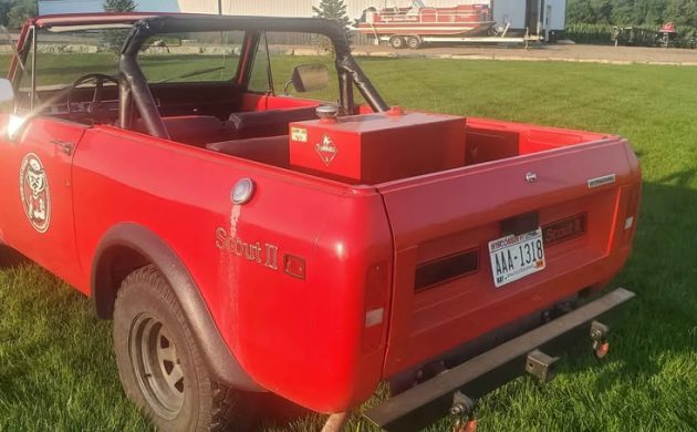International Harvester offered the 1980 Scout II in a variety of exterior colors, including Saffron Yellow, Copper, Winter White, Black Canyon Black, Embassy Gray, Concord Blue, Dark Brown, Green Metallic, and Tahitian Red Metallic. Two-tone graphic appliques and interior trim choices such as black vinyl, russet, tan, or blue patterns further enabled personalization. This Scout II has a unique back bumper and some custom decals on the door. The paint is damaged by the fuel intake which looks like it is from overfilling the fuel tank. The ad states that this Scout II has had 2 owners. It appears that there is an aftermarket fuel cell in the back bed that takes up most of the room. The usual rust we see on Scouts is not present and the listing states that the vehicle has no significant damage or problems. Prices of International Harvester Scouts were increasing, is this driver priced about right for its condition?