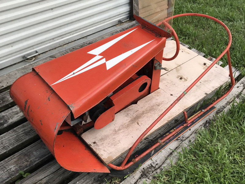 They were made mainly for cruising up to 35 mph across frozen lakes. Doesn’t that sound good right about now with hot and humid summer temps?! Hey, guys? Where’d everyone go?.. There are a ton of people in the upper-Midwest and Northeast US who collect things like this, restore them better than new, and then show them at gatherings with fellow enthusiasts. It’s really no different than restoring a car or motorcycle and showing them off at car or motorcycle shows. I believe the original engine would have been a 2.5 hp Clinton or Power Products two-cycle. I’m not sure if this is the original engine or not and it should match the body color of the sled, not be white. Do any of you tinker with and/or restore your toys for the upcoming seasons, or do you live where you don’t have to worry about trying to have fun in the snow and ice? Have you seen a David Bradley Ice Scooter before?