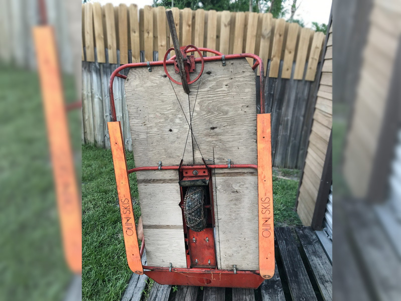 David Bradley only lived to the year 1899, but by that time he had built a powerhouse of a company on a full city block in Chicago. From a farmer to a major manufacturer, a few years after he passed away his family sold the huge company to Sears, in 1910. It’s no surprise that Sears, both in the US and Canada, sold the David Bradley Ice Scooter. You can see the unique drive system here, it’s basically a tire poking through the floor with a chain on it for traction on the ice, and a single ski on the front for steering. Someone has put two cut-off downhill skis on this one, and apparently there was a ski kit option as well as a snow plow option, both of which would be useful for snow instead of ice. A similar sled called the Ice Skeeter was made by Northern Manufacturing Co. out of Ohio.