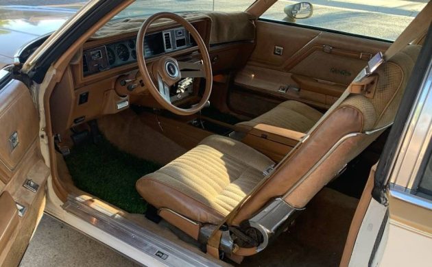 One interesting note regarding the ’79 edition is that it was the sole model that didn’t have a H/O the year before or after, making it somewhat unusual in the lineup and easily identifiable. Buyers could choose from either a black or white finish, with this one sporting the latter plus the attractive gold accents on the hood, top, and rear section of the trunk lid. The body appears decently preserved overall, with the only section of rust mentioned being a small spot on the left rear area of the trunk. With the lack of corrosion elsewhere, it makes me curious if perhaps a dealer drilled a couple of screw holes and attached a metal dealership name tag here, but that’s only speculation. A few minor repairs and a fresh paint job would really help make this Olds look great again outside.