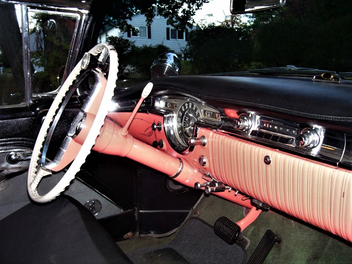 It looks like an older restoration in “Lead Sled” fashion, with Lake Pipes, fender skirts, whitewalls, Lancer-style front hubcaps, handpainted stripe work in the Von Dutch style, and pink-on-black color scheme. I say “older” because the pictures in the original listing show signs of deterioration. Specifically, I’m referring to the dashboard picture above where the carpet looks dirty, the picture below where the paint finish needs a good compounding, one picture in the original ad where the taillight chrome looks pitted, and another picture where the headliner has a tear in it.
