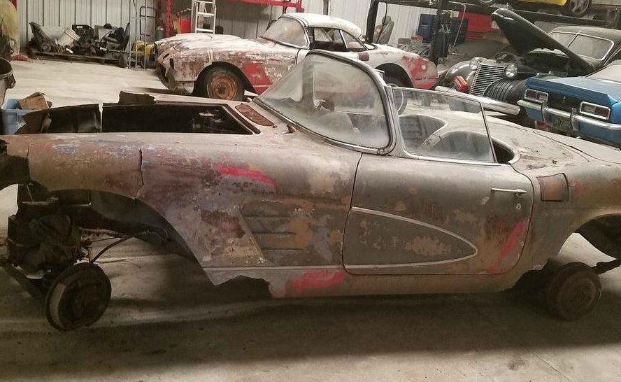 Looking at the pile of parts, some things there don’t belong to this car, in particular the 62 Corvette nose emblem, and the 56-60 trunk spare tire insert. The casting marks on the front of the heads shown, identify them as 69-79 heads, so they’re hardly original to the car either. I’m guessing that the rest of the engine is out of a different car too.