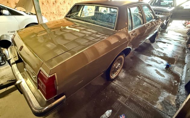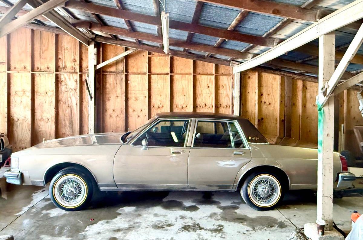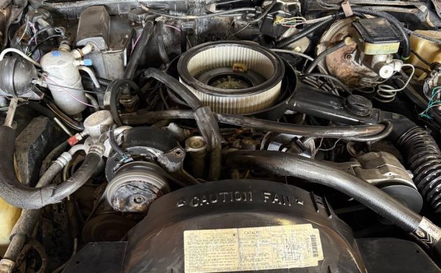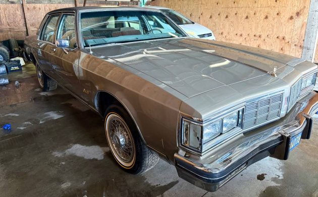 In 1983, Oldsmobile still produced both the luxury-oriented, longer wheelbase Ninety-Eight as well as several trim levels of the more sedate Eighty-Eight, including the Delta 88 Sedan, Delta 88 Royale in coupe and four-door sedan body styles, and the Delta 88 Royale Brougham (bro-ham if you prefer) also in coupe and four-door sedan variations. Oh, and not to be left out was a Custom Cruiser station wagon. Our subject Delta 88 Royale is one of 133K assembled in ’83, while the total Eighty-Eight production count fell just shy of 200K units. Finished in a typically bland, but very popular “Sandstone” hue, this Olds still wears a nice shine, with strong chrome, intact bumper fillers, and a sound-looking vinyl top. The wire wheel covers were all the rage in the eighties, and the new “Vogue” tires are a matter of subjective, and expensive, taste. It would have been nice to get an image or two of this sedan out from under its lean-to, but that’s all the listing included.