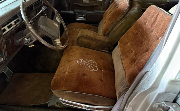 Check out that velour upholstered monogrammed front bench seat! I must say it seems odd that the monogram is part of the seat bottom and not the backrest, so I’m not sure what to make of that; it seems awkward to be parking one’s derriere on a crest of sorts. The stock interior image of a Delta Royale Brougham’s interior that I uncovered reveals no such artwork, so I’m thinking it’s a later add-on. Beyond that, the innards are pretty standard fare for GM in the mid-eighties. The instrument panel is simple and uninformative, the steering wheel has blown out a small chunk, and the rear seat appears to be in a more worn state than its personalized front companion.