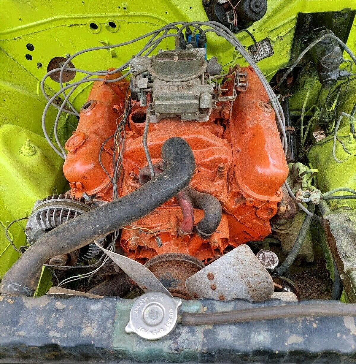 That engine compartment looks to have some yellow paint. overspray. paint on the shock towers ect. That just means that some work was attempted,original paint and how original is the paint. I,m not trying to pick it apart. I just had my 71 fc7 duster compleatly repainted and everything strip before paint.When its done there wont be any paint where it should not be.Nice combo and looks like a good to restore cuda. Back in the 80,s-90,s. I bought a 70 440 cuda 56k original miles and purple,$1000,70 barracuda convert $1200,a 70 challenger $300, 70 barracuda gran coupe $350. All where drivers!And hundreds of other brands. I bought and sold many since i read all the ads and knocked on a lot of doors. daily My friends that knew me than say i should write a book on what i had back then. Ford,chev ,gm stuff,mopars amongst other stuff ,boats i had it all and cant belive the prices now for resto. stuff. What a lucky guy i am to have had so many cars and the stories about them.