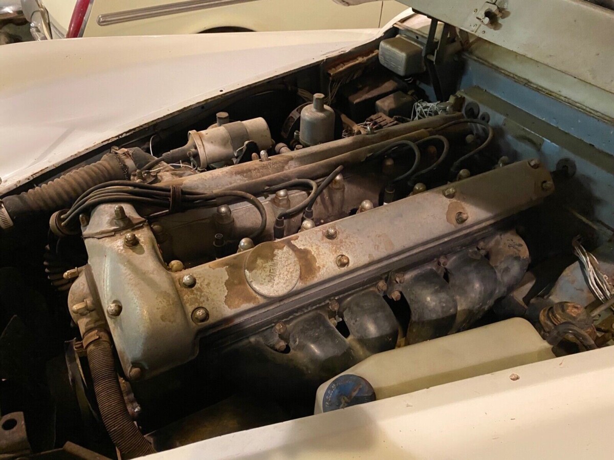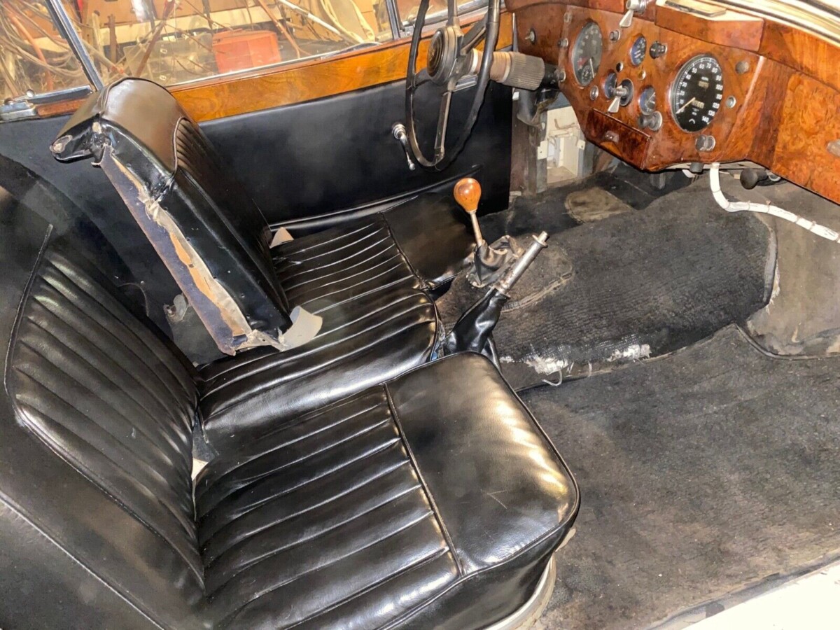 Though much of the XK140 was new, not much changed under the bonnet. The motor still displaced 3442 cc’s in an in-line six-cylinder twin overhead cam format. Horsepower rose to 190 since the XK120’s special equipment (SE) specifications were adopted for routine production. (The MC was an even better performer, utilizing the C-type head.) The transmission is a four-speed with overdrive (dash switch to the left of the steering wheel). The seller indicates that the car has been parked for 25 years but is driveable, a claim I find somewhat confusing. Either it has been parked, or it has been driven as recently as this listing. The seller also says this car has “updates to the drivetrain” but doesn’t specify what those are.