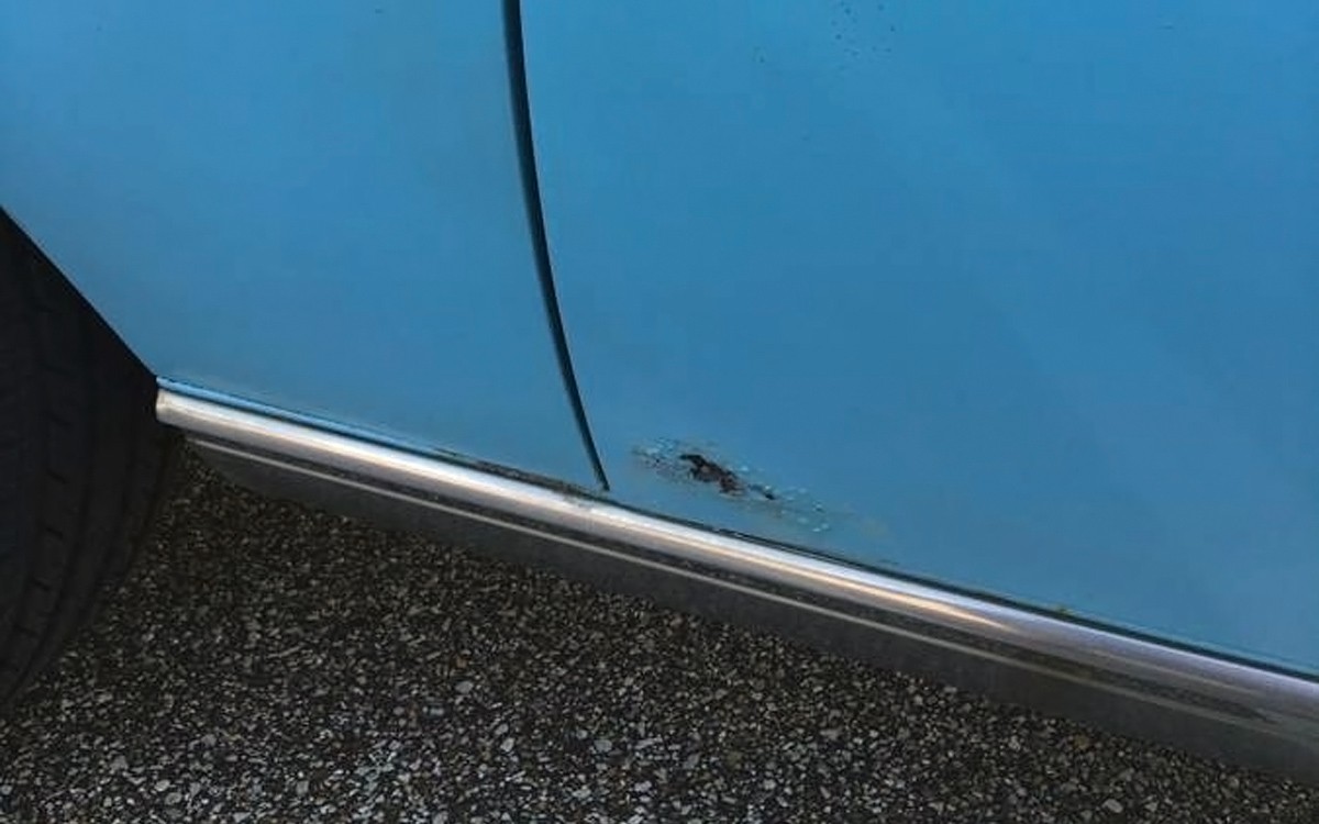 This is the only photo showing the passenger side, believe it or not. I don’t think the seller is trying to hide anything by not showing that side because they show us the rust issues so I’m guessing that it just slipped their mind. There is some rust on this car but nothing that looks overwhelming by any means. The right front fender top and under the windshield trim needs work but a bigger problem is the hole in the bottom of the passenger door seen above and the rear window trim area.
