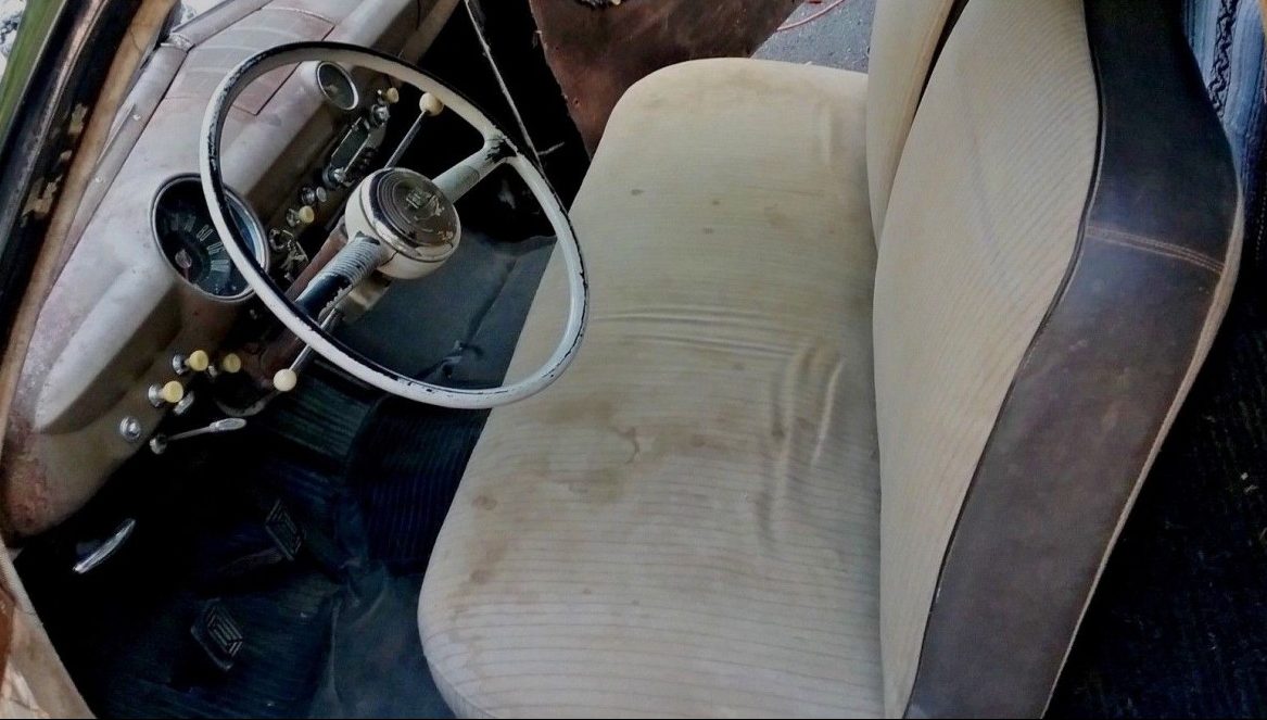 The interior is original and untouched. The front seat has some staining, but the integrity of the covers looks good. The door cards are rough and the seller states that the rear seat is not as good as the front. However, he has put blanket covers over both the front and back seats and has been using it as is.