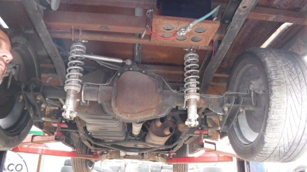 Here is the four-link rear suspension with coil over shocks. The body has been channeled down over the frame using the factory Lightning floor pan. The truck also features a front suspension from a Crown Vic, which is a very common upgrade to this generation of truck.