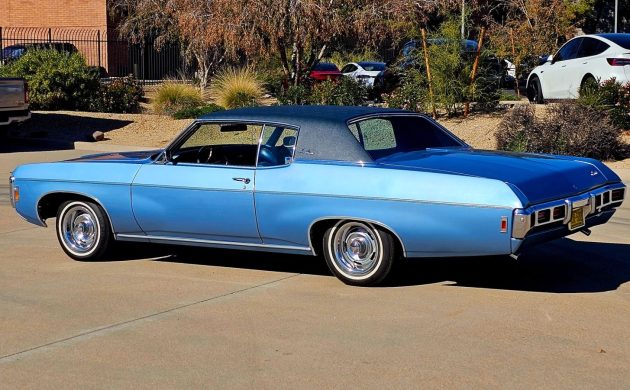 Chevrolet introduced the Impala Custom Coupe in 1968. It was the formal hardtop Caprice but in Impala trim (not a fastback). This 1969 edition looks like a brand-new car, a testament to the loving care given to it over 57 years by its two owners. The odometer says 52,000 miles, and there’s no reason to doubt it by what we see. Located in Phoenix, Arizona, this Glacier Blue beauty is available through a dealer here on eBay. No takers so far on the $15,000 starting bid, which is below the reserve and the Buy It Now price of $29,900 (which gets you free shipping).
