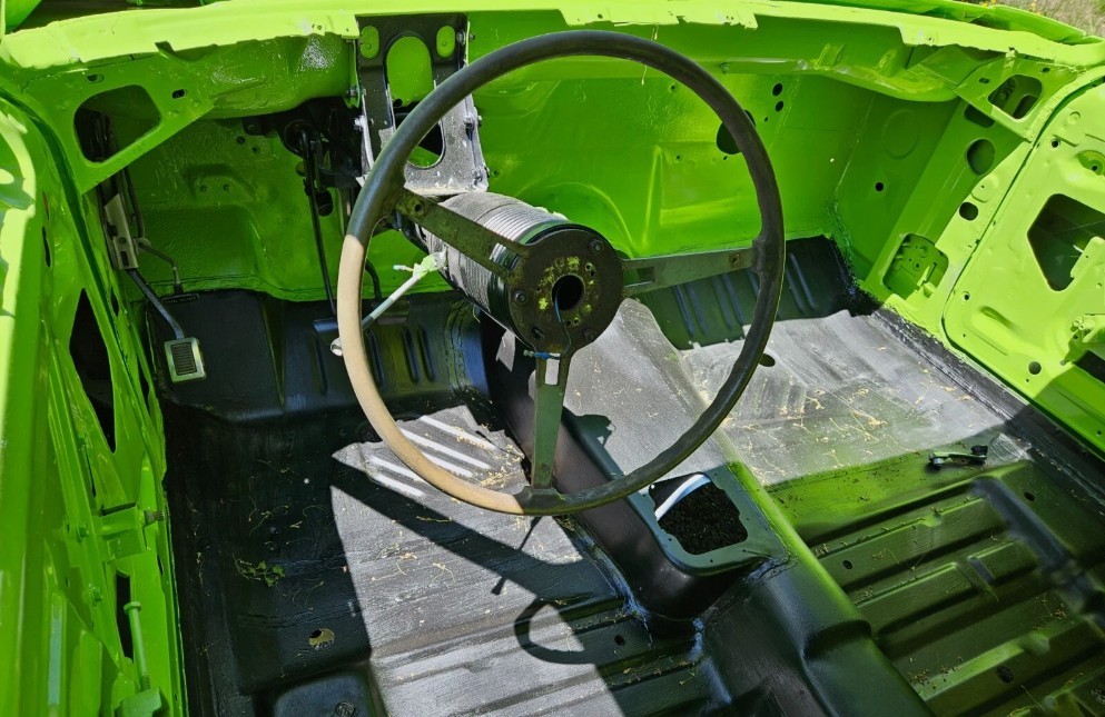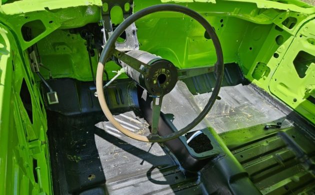 Unlike a lot of cars like this that we find, the seller has put a lot of effort into telling us what’s here and what’s not. The car was stripped down to the basics, had whatever body work that was needed done, and repainted in its original Limelight color (aka Sublime Green over at Dodge, one of Chrysler’s Hi-Impact colors). Stripes have been redone, reminding us this was a 383 car, one of 1,905. But how many of those 4-speed Mopars left the factory in Limelight and have avoided the crusher after 55 years?