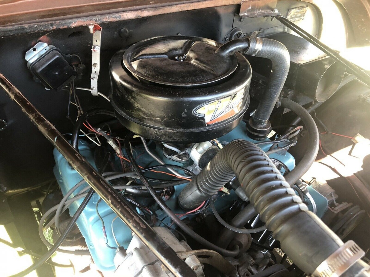 V6 engine not available on 1965 Jeeps,, a ’66 option. This is a poorly mounted replacement 1964 Buick 225. Manifod resting on steering box..